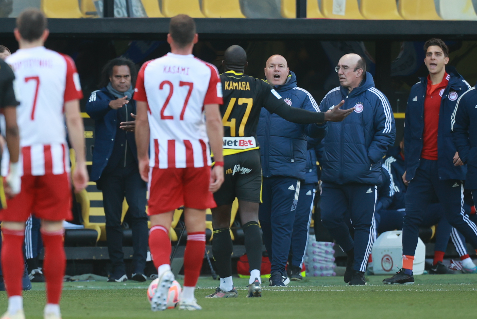 Προκλητικοί ήταν και οι ποδοσφαιριστές του Αρη, οι οποίοι σε όλη τη διάρκεια του παιχνιδιού έκαναν πολύ σκληρά μαρκαρίσματα στους Ερυθρόλευκους, με αποκορύφωμα τη συμπεριφορά του Αμπουμπακάρ Καμαρά. Ο Αφρικανός επιθετικός, ο οποίος είδε την κίτρινη κάρτα για επικίνδυνο παίξιμο, σε όλη τη διάρκεια του παιχνιδιού προκαλούσε.