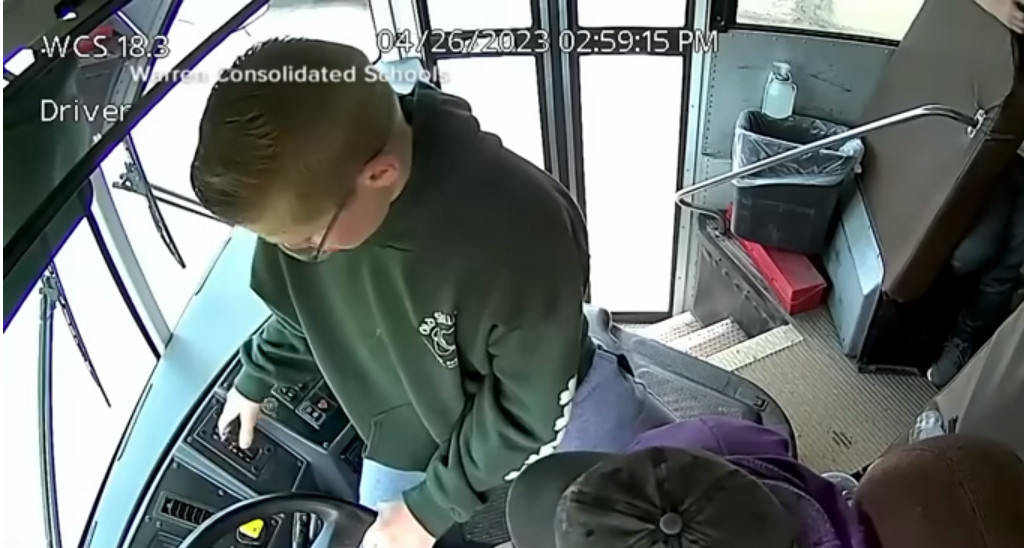 Σε βίντεο από κάμερα του σχολικού, φαίνεται ο οδηγός να αισθάνεται δυσφορία και κάποια στιγμή να λιποθυμάει. Ο 13χρονος μαθητής σπεύδει και παίρνει τον έλεγχο του τιμονιού, πατάει φρένο και ακινητοποιεί το όχημα, ενώ ακούγονται κραυγές από τρομοκρατημένα παιδιά. Στη συνέχεια ακούγεται να φωνάζει στους συμμαθητές του να τηλεφωνήσουν αμέσως για να ζητήσουν βοήθεια.