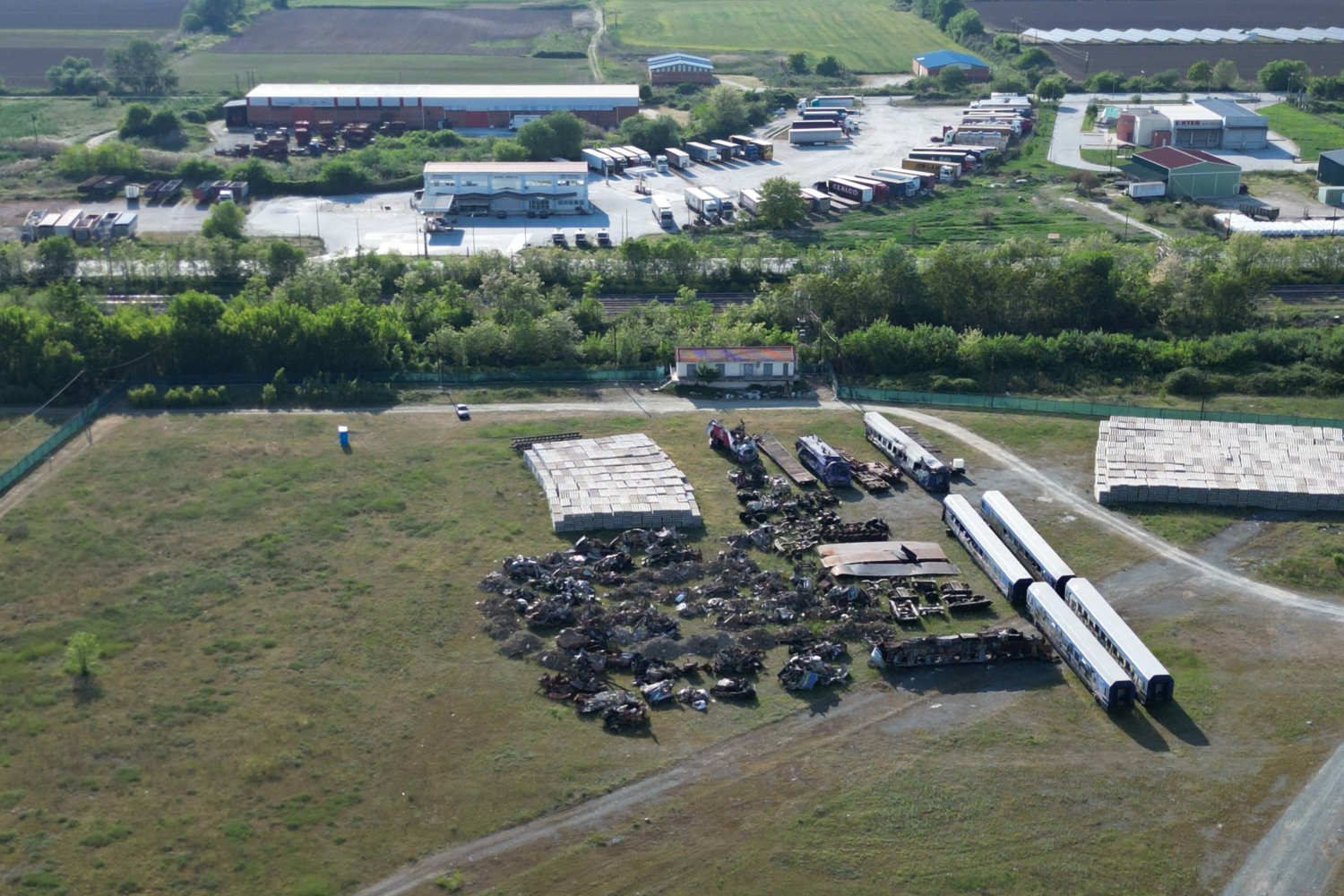 Ό,τι απέμεινε μετά τη φονική σύγκρουση στα Τέμπη, βαγόνια και συντρίμμια, βρίσκεται σε χώρο στην παλιά εθνική Λάρισας – Θεσσαλονίκης στο ύψος του Εργοστασίου Ζάχαρης.