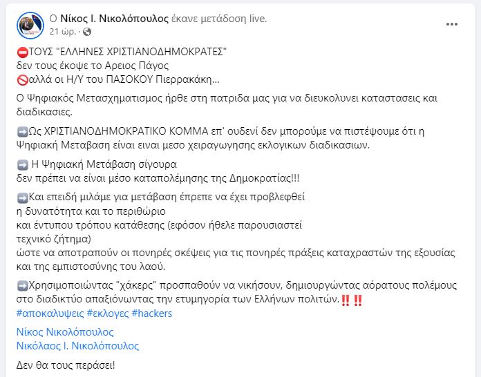 «Δεν μας έκοψε ο Άρειος Πάγος αλλά οι χάκερς του Πασόκου Πιερρακάκη» υποστηρίζει ο Νίκος Νικολόπουλος