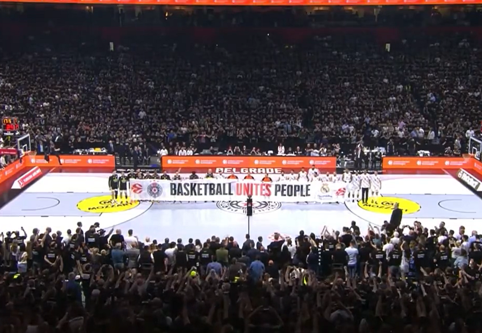 Οι παίκτες της Παρτιζάν και της Ρεάλ Μαδρίτης έστειλαν κοινό μήνυμα πριν την έναρξη του αγώνα στο Βελιγράδι, κρατώντας ένα πανό που έγραφε «Το μπάσκετ ενώνει τους ανθρώπους».