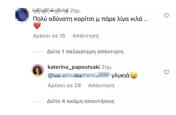 «Πολύ αδύνατη κορίτσι μου πάρε λίγα κιλά», ήταν ένα σχόλιο με την Κατερίνα Παπουτσάκη να απαντά: «Γλυκιά» προσθέτοντας ένα emoji.