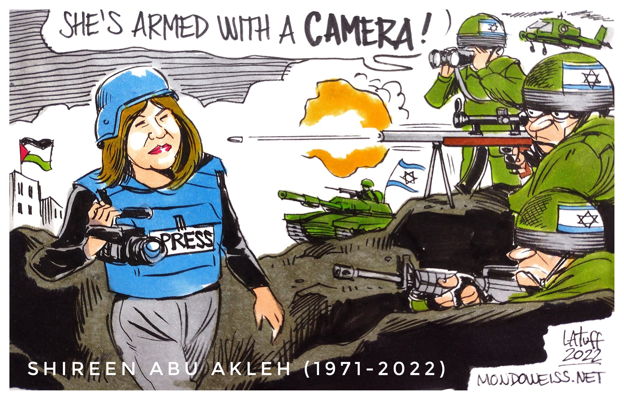 Με αφορμή την Παγκόσμια Ημέρα Ελευθερίας του Τύπου, διεθνείς οργανισμοί και δημοσιογραφικές ενώσεις εκφράζουν την ανησυχία τους για τις απειλές που αντιμετωπίζει, επισημαίνοντας τους εκφοβισμούς, τις φυλακίσεις, τις δολοφονίες δημοσιογράφων (στο σκίτσο, επάνω, η Σιρίν Αμπού Ακλεχ που κρατάει μια κάμερα και άρα θεωρείται «οπλισμένη»).