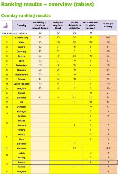 Ειδικότερα, στην έκθεση ερευνώνται 30 ευρωπαϊκές χώρες (ΕΕ27, Νορβηγία, Ελβετία, Ην. Βασίλειο) και οι πρωτεύουσές τους, σύμφωνα με 4 κριτήρια: την απλότητα του συστήματος έκδοσης εισιτηρίων, την τιμή των εισιτηρίων διαρκείας, τα εκπτωτικά εισιτήρια σε κοινωνικά αδύναμες ομάδες και τον συντελεστή ΦΠΑ.