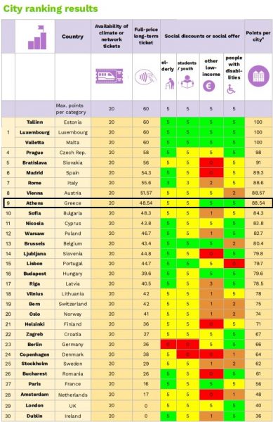 Η Αθήνα τα πηγαίνει πολύ καλά, σημειώνοντας ένα τελικό 88.54, το οποίο την φέρνει στην 9η θέση πανευρωπαϊκά. «Το ετήσιο εισιτήριο στην Αθήνα κοστίζει 300€, που ισοδυναμεί με 357€ μετά την προσαρμογή του επιπέδου τιμής» λέει η έκθεση.