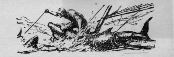 Παρασυρμένος από την επιτυχία, ο Σαντιάγκο σκέπτεται τη θριαμβευτική υποδοχή που θα του κάνουν οι συνάδελφοί του στο λιμάνι. Όμως η αυταπάτη δεν διαρκεί πολύ. Ένα κοπάδι σκυλόψαρα, που τα τράβηξε η μυρουδιά του αίματος του σκοτωμένου ψαριού, αρχίζει να παρακολουθή τη βάρκα, να επιτίθεται και σιγά-σιγά να ξεσκίζη το χονδρό ψάρι που είναι δεμένο. Ο Σαντιάγκο αδίκως προσπαθεί με το καμάκι του να κρατήση μακρυά τους καρχαρίες. Παρά τις προσπάθειές του, το ψάρι του καταβροχθίζεται.