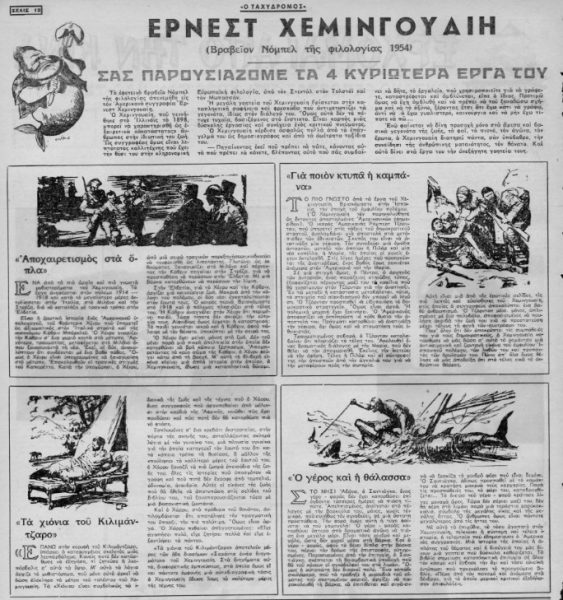 Στον τιμηθέντα και με το Νομπέλ Λογοτεχνίας (1954) Χέμινγουεϊ, έναν από τους σημαντικότερους συγγραφείς ολόκληρου του 20ού αιώνα, ήταν αφιερωμένο ένα δημοσίευμα του «Ταχυδρόμου» που είχε κυκλοφορήσει στις 4 Δεκεμβρίου 1954.