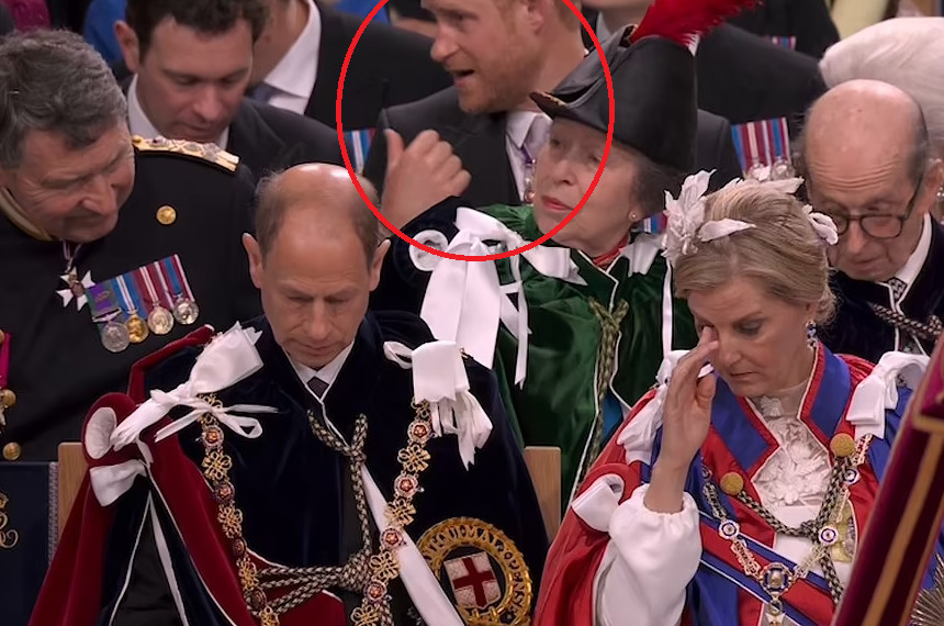 Στα τηλεοπτικά πλάνα, διακρίνεται ο Πρίγκιπας Χάρι στην τρίτη σειρά των καθισμάτων, δύο σειρές πίσω από τον αδερφό του, τον Πρίγκιπα Γουίλιαμ. Την ώρα που ο Βασιλιάς Κάρολος περνάει με το στέμμα στο κεφάλι και όλο το Αββαείο του Γουέστμινστερ έψελνε τον εθνικό ύμνο, ο Δούκας του Σάσεξ φαίνεται να κλείνει το στόμα του.