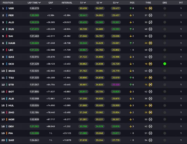 Ο πρωταθλητής αύξησε τη διαφορά του στην κατάταξη των οδηγών από τον δεύτερο Πέρεζ στους 14 βαθμούς, αφού εκτός από τους βαθμούς της νίκης πήρε και τον έξτρα του ταχύτερου γύρου.