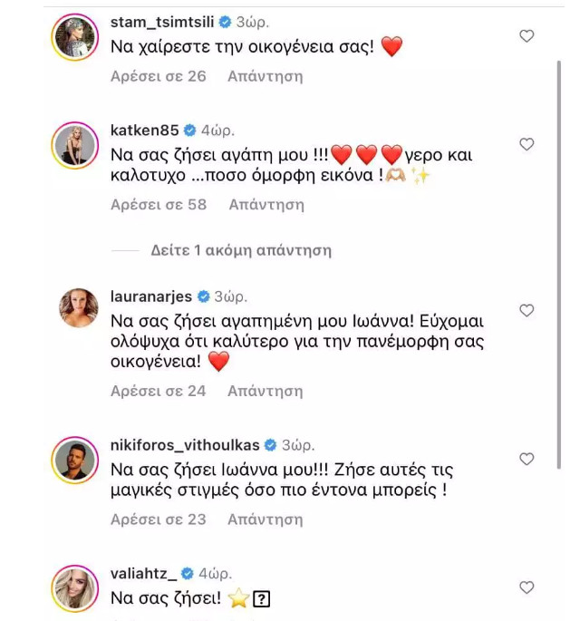 Η Ιωάννα Μαλέσκου δέχτηκε τις πιο όμορφες και γλυκές ευχές από παρουσιαστές, ηθοποιούς και γνωστά πρόσωπα της showbiz, όπως η Σταματίνα Τσιμτσιλή, η Κατερίνα Καινούργιου, η Λάουρα Νάργες, η Έλενα Τσαγκρινού, η Ευρυδίκη Παπαδοπούλου, η Ζωή Κρονάκη, η Ράνια Θρασκιά και πολλοί άλλοι.