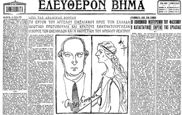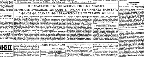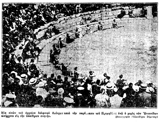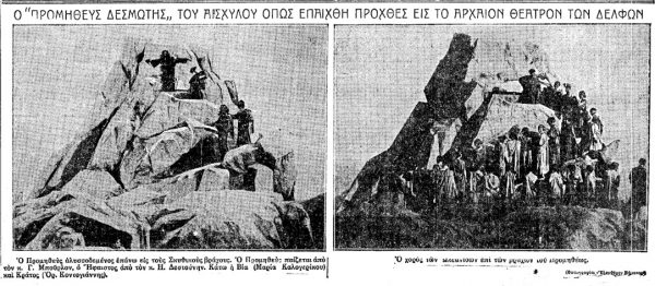 Την Τετάρτη 11 Μαΐου 1927 το «Ελεύθερον Βήμα» είχε στο πρωτοσέλιδό του δύο μεγάλες φωτογραφίες της παράστασης του «Προμηθέως Δεσμώτη» που είχε παιχτεί πριν από δύο ημέρες στο δελφικό θέατρο.