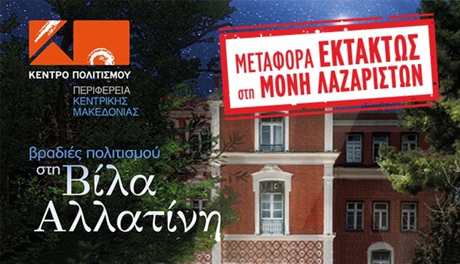 Η εκδήλωση μεταφέρεται εκτάκτως στον αύλειο χώρο της Μονής Λαζαριστών (Κολοκοτρώνη 25-27), στη Σταυρούπολη.
