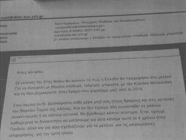«Η κ. Κεραμέως έστειλε email στη Δευτεροβάθμια Εκπαίδευση Καβάλας, όπου καλούσε να ψηφίσουν τη ΝΔ, με αποτέλεσμα να την καταγγείλει η πρόεδρος της ΕΛΜΕ Καβάλας.