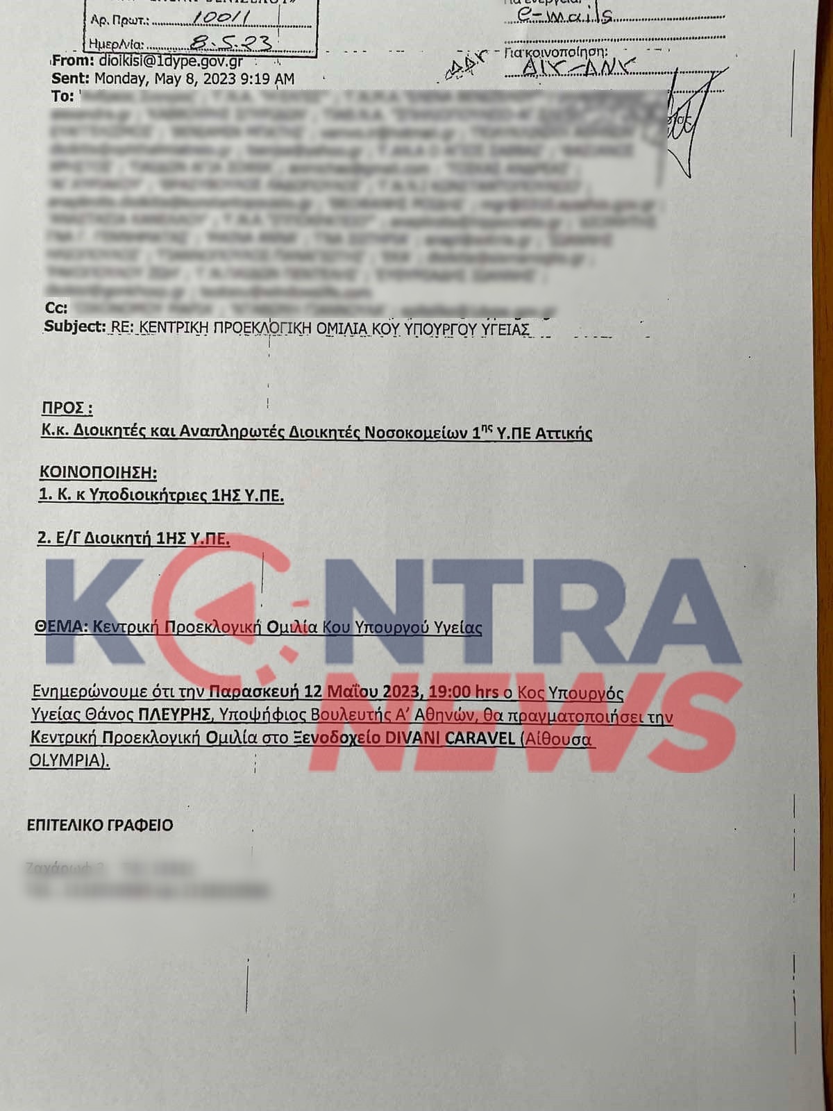 »Ο δε κ. Πλεύρης, όπως αποκαλύπτει σήμερα η Kontra News, έστειλε email προς τις διοικήσεις των νοσοκομείων της Αθήνας για προεκλογική του συγκέντρωση. Αποκάλυψη που επιβεβαίωσε και ο ίδιος, προσπαθώντας να συμμαζέψει τα ασυμμάζευτα».