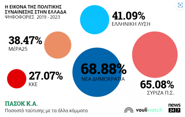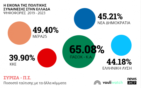 Κατά τη πρώτη διετία της διακυβέρνησης Μητσοτάκη, το ΠΑΣΟΚ ήταν απολύτως ισορροπημένο στην ταύτιση του με την Νέα Δημοκρατία και τον ΣΥΡΙΖΑ.