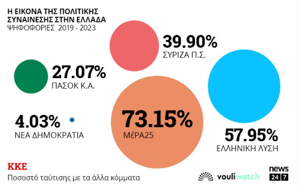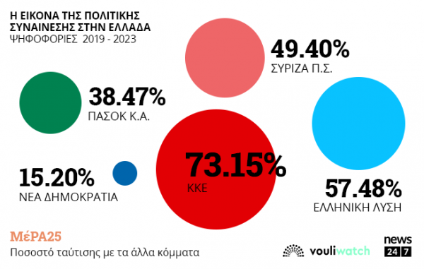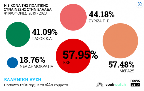 Στον αντίποδα, η Ελληνική Λύση έχει το υψηλότερο ποσοστό σύμπλευσης με την Ν.Δ. που φτάνει το 18,76%.