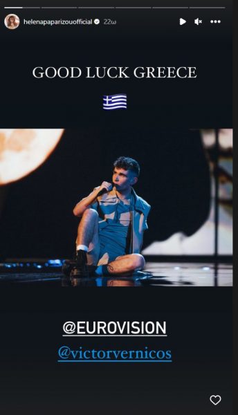 Η Έλενα Παπαρίζου λίγες ώρες νωρίτερα είχε στείλει τις ευχές της στον Βίκτωρα Βερνίκο και τον Andrew Lambrou, που εκπροσώπησαν αντίστοιχα Ελλάδα και Κύπρο στον Β’ Ημιτελικό της Eurovision.