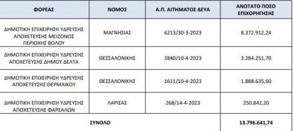 Το εν λόγω ποσό διατίθεται στις Δημοτικές Επιχειρήσεις Ύδρευσης – Αποχέτευσης (Δ.Ε.Υ.Α.) για την εξόφληση των απλήρωτων υποχρεώσεών τους που απορρέουν από δικαστικές αποφάσεις που έχουν καταστεί τελεσίδικες έως την 31η Ιανουαρίου 2023 και αφορούν σε αξιώσεις από προμήθειες αγαθών ή παροχή υπηρεσιών ή εκτέλεση έργων κατά ποσοστό ογδόντα τοις εκατό (80%), συμπεριλαμβανομένων των παρεπόμενων απαιτήσεων και δικαστικών δαπανών, με την υποχρέωση κάλυψης της διαφοράς, ως ακολούθως: