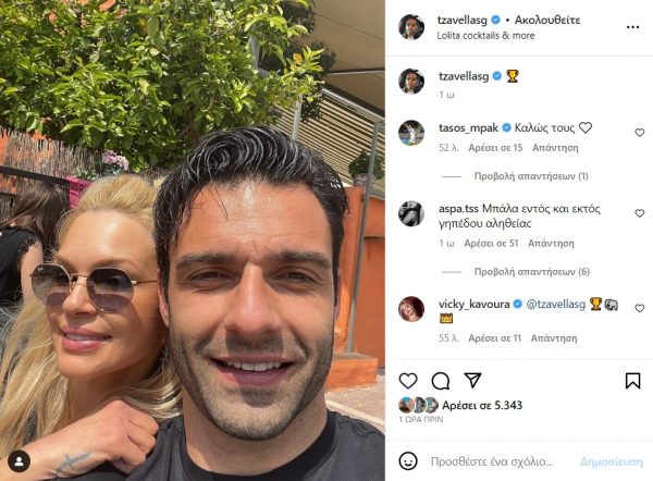 Πριν λίγες ημέρες, και η Βίκυ Κάβουρα είχε κάνει την πρώτη της ανάρτηση με τον Γιώργο Τζαβέλλα. Με αφορμή την ονομαστική γιορτή του αγαπημένου της δημοσίευσε φωτογραφία από την ηλιόλουστη βόλτα τους, εκφράζοντας την αγάπη της προς το πρόσωπό του.