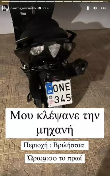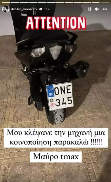 Με στόρι που ανέβασε στο Instagram του δείχνει τη μηχανή του και τις πινακίδες του και γράφει σε ποια περιοχή κλάπηκε το όχημά του και ποια ώρα.