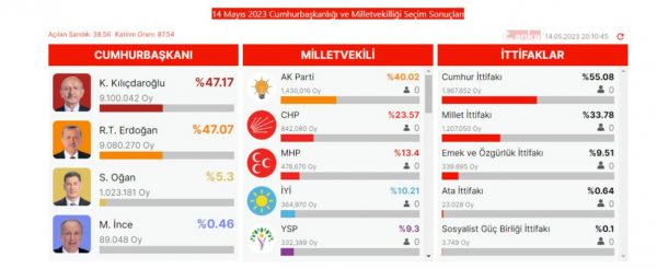 Δήλωση του προέδρου της Τουρκίας Ρετζέπ Ταγίπ Ερντογάν ενώπιον των υποστηρικτών του: «Η χώρα μας ολοκλήρωσε μ’ επιτυχία άλλη μια γιορτή δημοκρατίας με τις εκλογές της 14ης Μαΐου. Παρόλο που τα αποτελέσματα δεν είναι ακόμη τελικά, βρισκόμαστε μπροστά, σε μεγάλο βαθμό.
