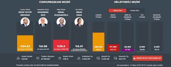 Νωρίτερα, ο Φάικ Οζτράκ, εκπρόσωπος του Ρεπουμπλικανικού Λαϊκού Κόμματος του Κιλιτσντάρογλου, δήλωσε ότι βλέπουν θετική εικόνα ακόμη και όταν ο κρατικός τηλεοπτικός σταθμός TRT έδειξε ότι ο Ερντογάν προηγείται κατά 59% έως 35% με βάση τα αρχικά αποτελέσματα.