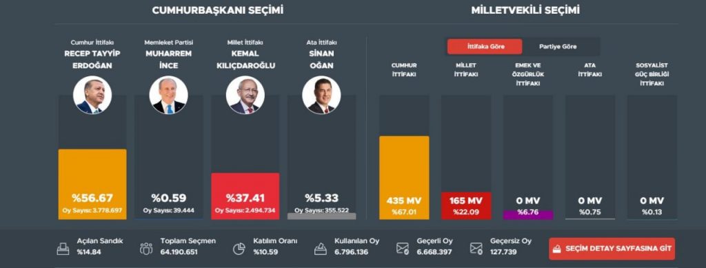 Με καταμετρημένο το 41,8% της επικράτειας, ο Ερντογάν προηγείται με 52,6% με τον Κιλιτσντάρογλου να βρίσκεται στο 41,6%.