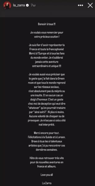 Σάλος ξέσπασε στα social media κατά τη διάρκεια της Eurovision με την εκπρόσωπο της Γαλλίας. Η La Zarra έλαβε από το κοινό μόνο 50 βαθμούς και έδειξε τη δυσαρέσκειά της κάνοντας μία άσεμνη χειρονομία.