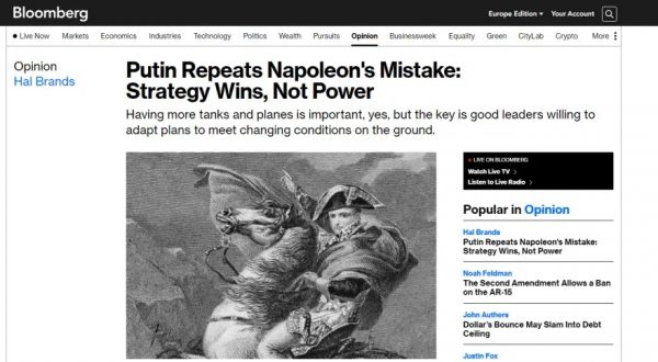 Στις κινήσεις του Βλαντίμιρ Πούτιν μετά την εισβολή στην Ουκρανία και το γεγονός ότι ο ρωσικός στρατός έχει αρχίσει να φθείρεται μετά από περισσότερο έναν χρόνο πολέμου αναφέρεται μία εκτενής ανάλυση του Bloomberg που εστιάζει στη σημασία της στρατηγικής, σημειώνοντας πως ο Ρώσος πρόεδρος επαναλαμβάνει το λάθος του Ναπολέοντα.