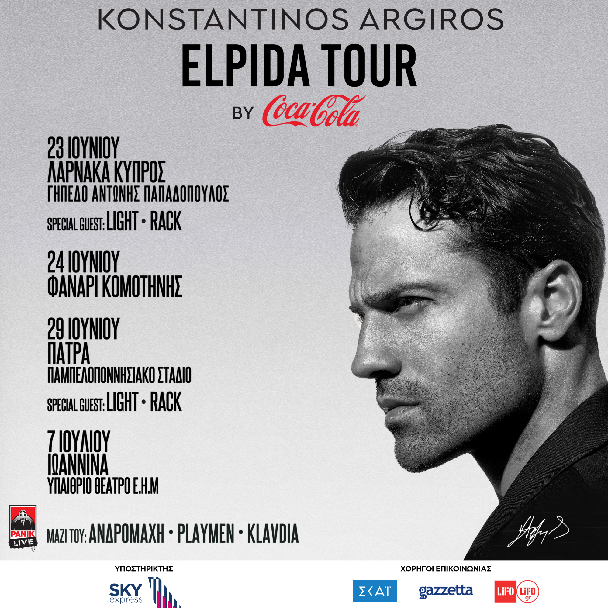 Ο καλλιτέχνης – φαινόμενο, με τις διαδοχικές no1 επιτυχίες που «μαγεύουν» τις καρδιές του κόσμου και κατακτούν πρωτιές στα digital streams, το ραδιοφωνικό airplay και το YouTube και τις αμέτρητες sold out εμφανίσεις, ταξιδεύει με το «Elpida Tour», μία μεγάλη, εντυπωσιακή και υψηλών προδιαγραφών παραγωγή της Panik Live, με την υποστήριξη της Coca-Cola.