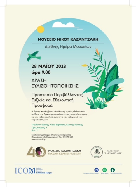 Το Μουσείο Νίκου Καζαντζάκη, στο πλαίσιο του εορτασμού της Διεθνούς Ημέρας Μουσείων 2023 και αξιοποιώντας το γεγονός ότι βρίσκεται στη Μυρτιά, μέσα σε ένα χαρακτηριστικό τοπίο της κρητικής ενδοχώρας, διοργανώνει δράση ευαισθητοποίησης σχετικά με την προστασία του περιβάλλοντος, την ευζωία, την εθελοντική προσφορά και την προσωπική ανάπτυξη.