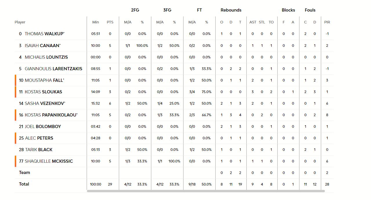 Μέσα σε όλα, οι Πειραιώτες έχασαν από νωρίς με δύο φάουλ τον Τόμας Ουόκαπ (05:51 χρόνος συμμετοχής στο πρώτο ημίχρονο), ενώ έχουν με δύο φάουλ και τον Ταρίκ Μπλακ (05:13), με τον Τζοέλ Μπολομπόι να τελειώνει το πρώτο ημίχρονο.