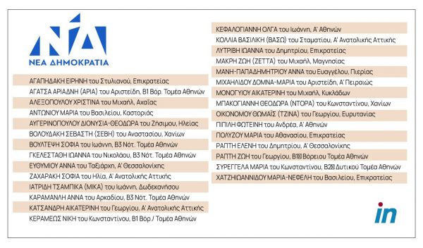 Στα έδρανα της Νέας Δημοκρατίας, σύμφωνα με τα αποτελέσματα των εθνικών εκλογών, κάθονται πλέον 29 γυναίκες.