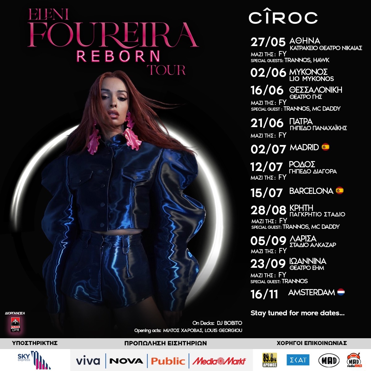 Στο πλαίσιο του «Reborn Tour», η Ελένη Φουρέιρα θα ταξιδέψει και σε πόλεις του εξωτερικού, όπως η Μαδρίτη, η Βαρκελώνη και το Άμστερνταμ, βάζοντας στον ρυθμό της και την Ευρώπη, όπως είχε κάνει και στην προηγούμενη μεγάλη και sold out περιοδεία της.