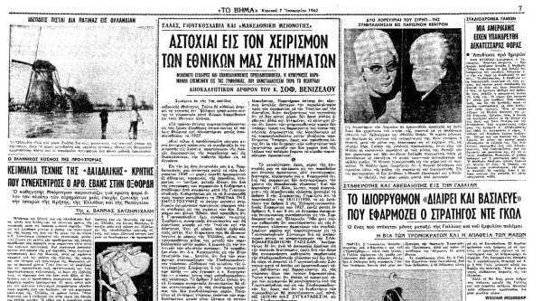 «ΤΟ ΒΗΜΑ», 7.1.1962, Ιστορικό Αρχείο «ΤΟ ΒΗΜΑ» & «ΤΑ ΝΕΑ»