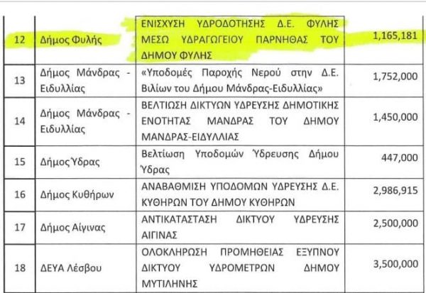 Το έργο που εγκρίθηκε για χρηματοδότηση έχει τίτλο«Ενίσχυση υδροδότησης δημοτικής ενότητας Φυλής μέσω υδραγωγείου Πάρνηθας του Δήμου Φυλής» που στοχεύει στην κάλυψη όλης της κατανάλωσης της Φυλής σε νερό. Το έργο εντάχθηκε στο Ταμείο Ανάκαμψης την Παρασκευή 19 Μαΐου 2023 και έχει προϋπολογισμό 1,16 εκατ. Ευρώ πλέον ΦΠΑ.