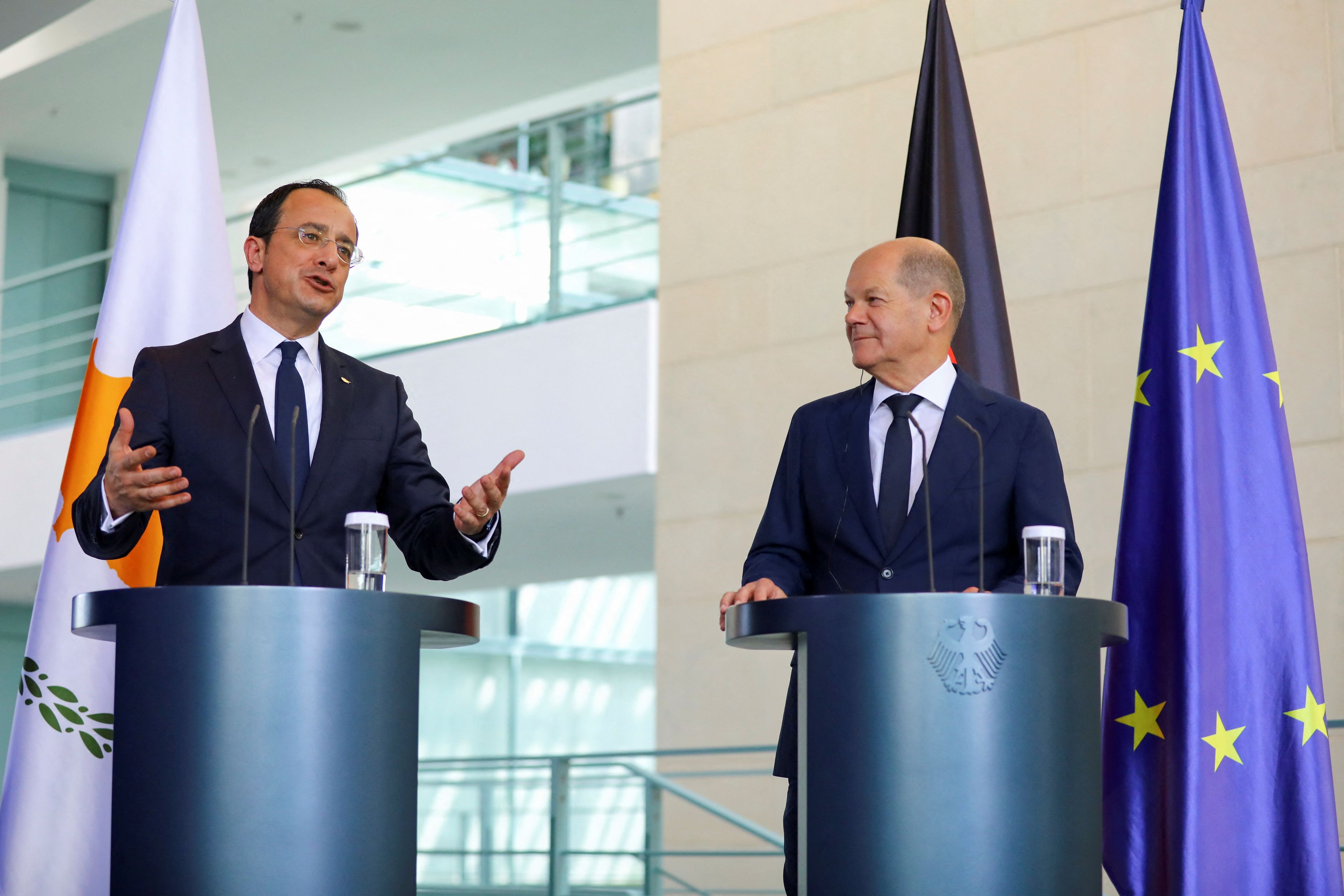 Ειδικότερα, κ. Σολτς, κατά τη διάρκεια της κοινής συνέντευξης Τύπου που παραχώρησε με τον Πρόεδρο της Κυπριακής Δημοκρατίας Νίκο Χριστοδουλίδη, τον οποίο υποδέχθηκε στο Βερολίνο, είπε ότι «θα επιθυμούσα το αδιέξοδο της διαπραγματευτικής διαδικασίας να αποκτήσει επιτέλους νέα δυναμική».