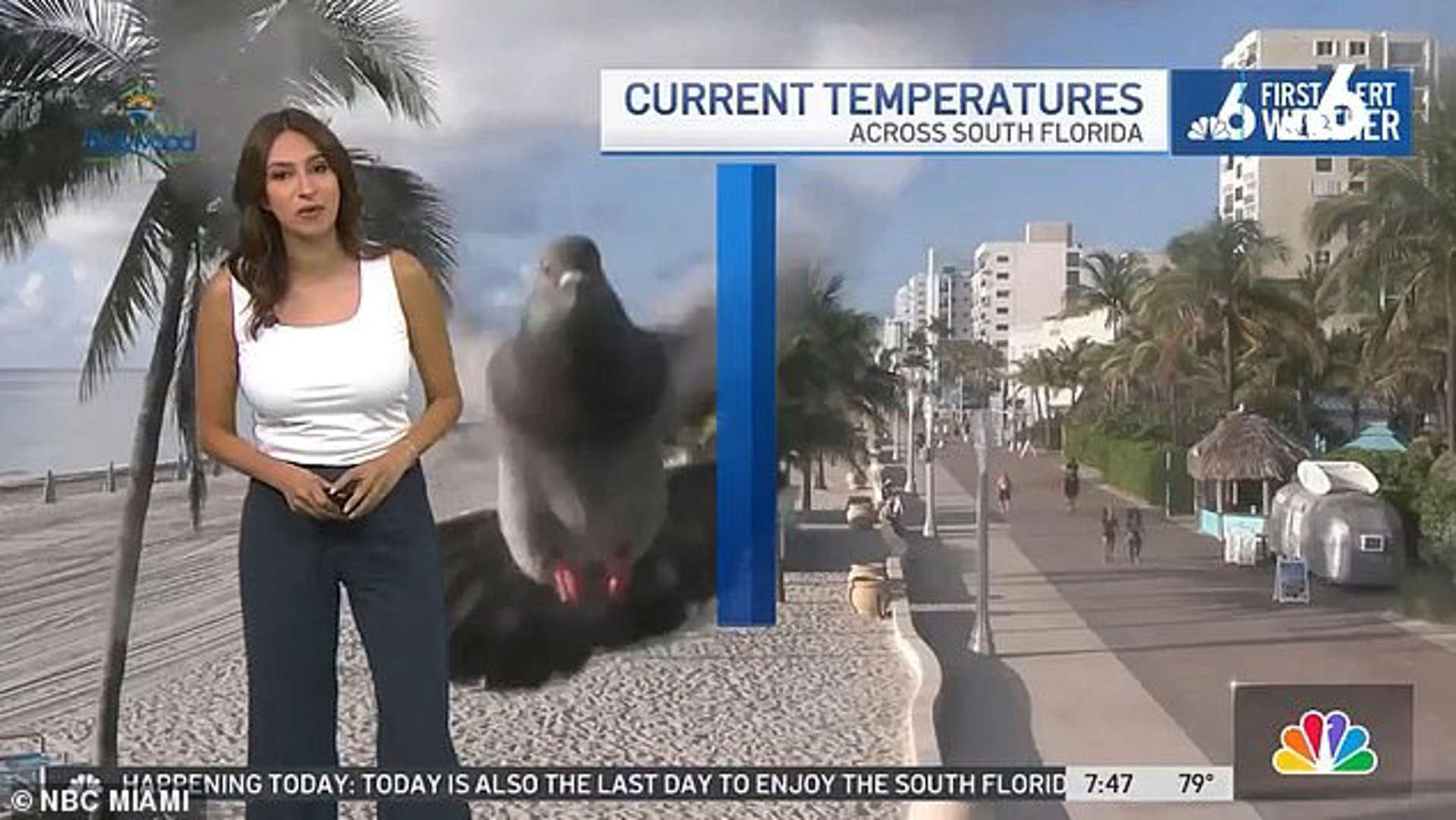 Η Chelsea Ambriz από τον σταθμό NBC 6, ετοιμαζόταν να παρουσιάσει την πρόγνωση του καιρού, όταν ένα μεγάλο περιστέρι έπεσε πάνω στην κάμερα καιρού στην παραλία του Χόλιγουντ, με αποτέλεσμα η μετεωρολόγος να ουρλιάξει από τον τρόμο.