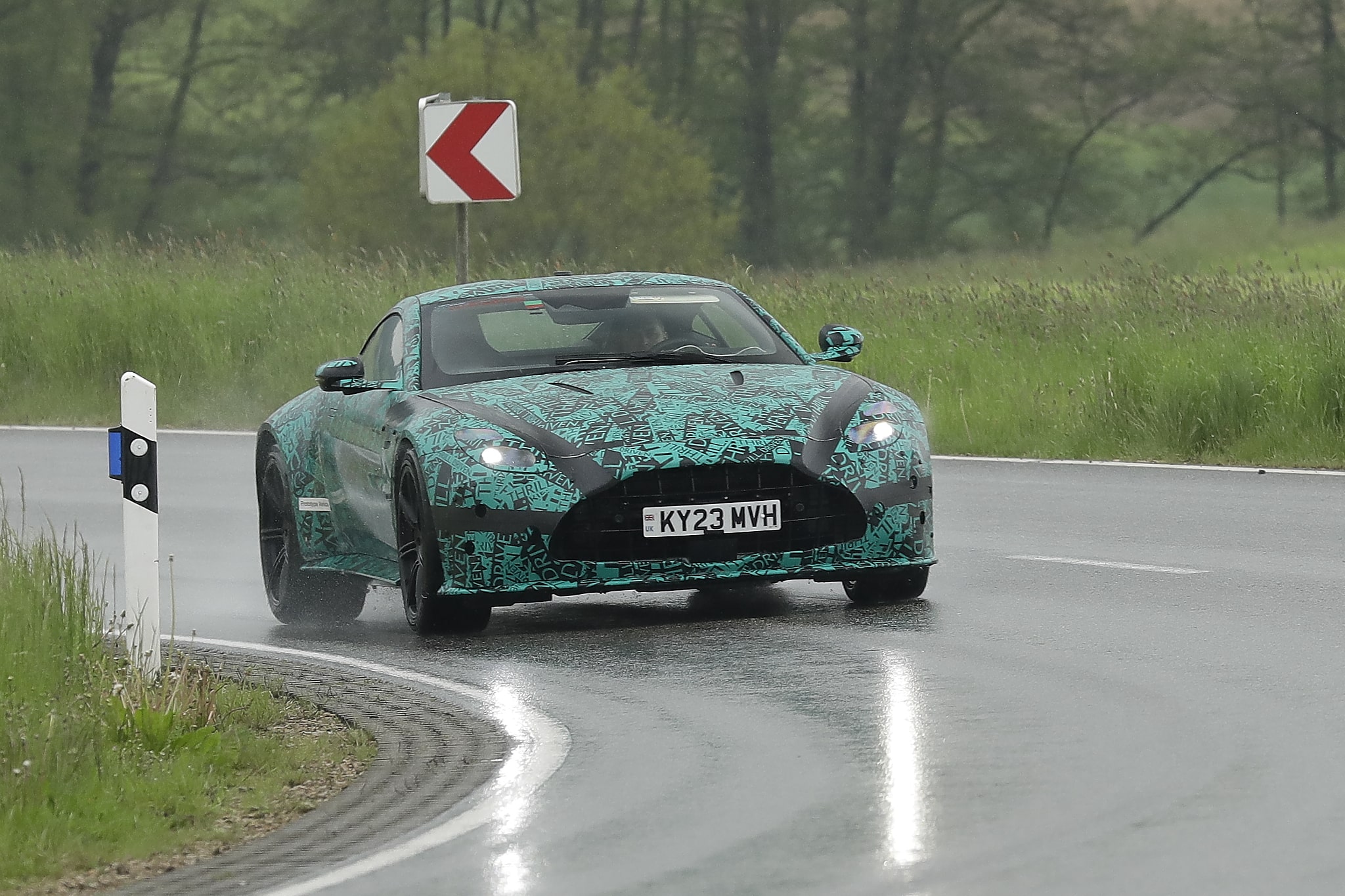 To επίμαχο δοκιμαστικό πρωτότυπο εντοπίστηκε από τον φωτογραφικό φακό στα πέριξ του Nurburgring υπό σφοδρή καταιγίδα να δημιουργεί ένα επιπλέον εφέ κατά τους ελιγμούς της γοητευτικής Vantage.