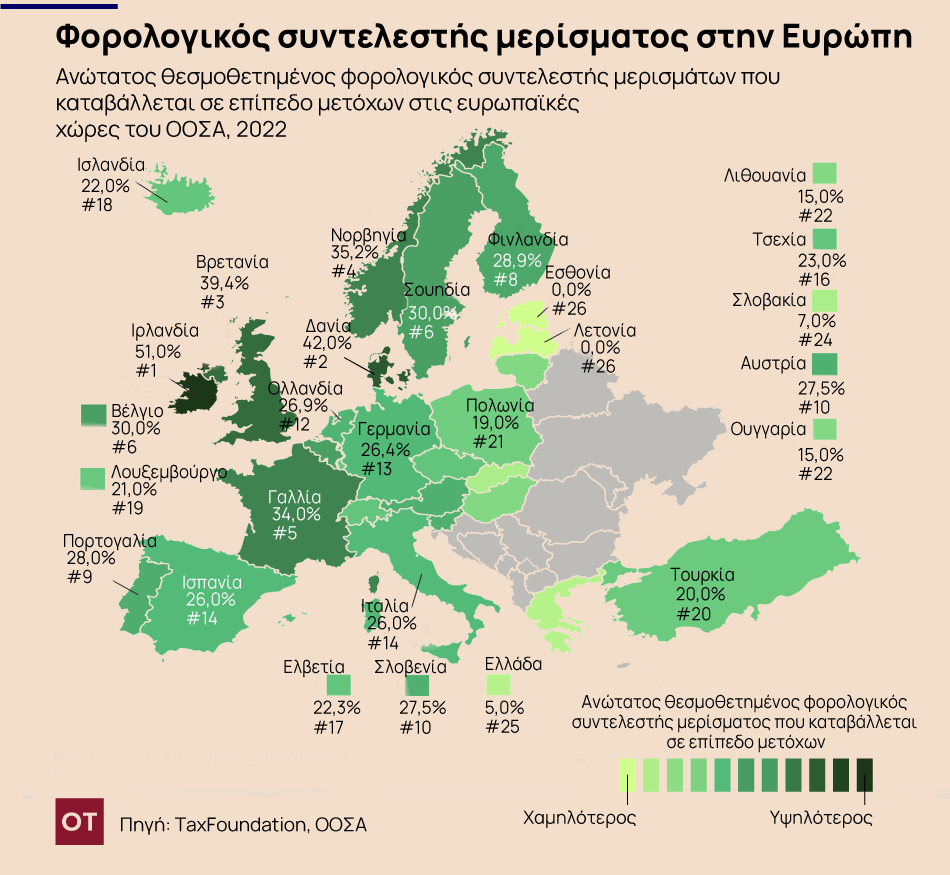 Στα μερίσματα, Βουλγαρία, Ρουμανία, Σλοβενία και Ελλάδα έχουν τον ίδιο συντελεστή (5%), ενώ πολλές ευρωπαϊκές χώρες έχουν πολύ υψηλότερους, όπως προκύπτει από τα πλέον πρόσφατα στοιχεία του ΟΟΣΑ, τα οποία επεξεργάστηκε και το Tax Foundation. Σύμφωνα με αυτά, η Ιρλανδία έχει τον υψηλότερο ανώτατο φορολογικό συντελεστή μερισμάτων μεταξύ των ευρωπαϊκών χωρών του ΟΟΣΑ, 51%. Ακολουθούν η Δανία και το Ηνωμένο Βασίλειο με 42% και 39,4%, αντίστοιχα.
