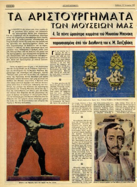 Αυτό είναι ένα απόσπασμα από το εισαγωγικό σημείωμα του «Ταχυδρόμου» στο αφιέρωμα που είχε κάνει στο Μουσείο Μπενάκη, στο τεύχος του που είχε κυκλοφορήσει στις 10 Ιανουαρίου 1959. Ο τότε διευθυντής του μουσείου, ο Μανόλης Χατζηδάκης, είχε κληθεί από τον «Ταχυδρόμο» να επιλέξει και να παρουσιάσει τα πέντε ωραιότερα εκθέματά του, στο πλαίσιο μιας σειράς δημοσιευμάτων του περιοδικού που αφορούσαν τα αριστουργήματα των μουσείων της χώρας μας.