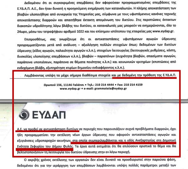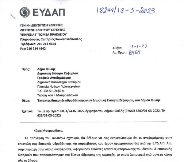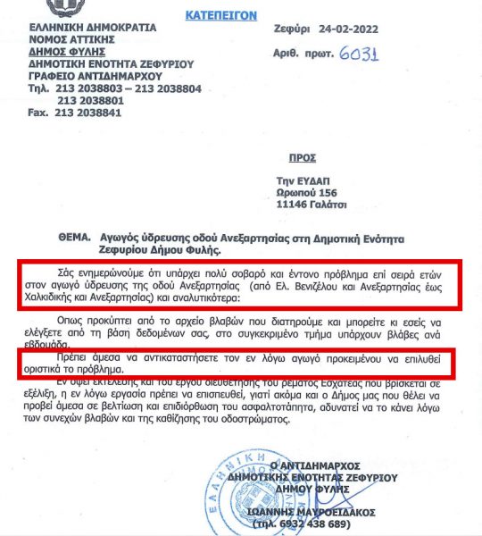 Ακολουθούν τα έγγραφα που έχουν ανταλλαγεί μεταξύ του Αντιδημάρχου και τις ΕΥΔΑΠ, όπως τα δημοσιοποίησε ο Δήμος Φυλής.