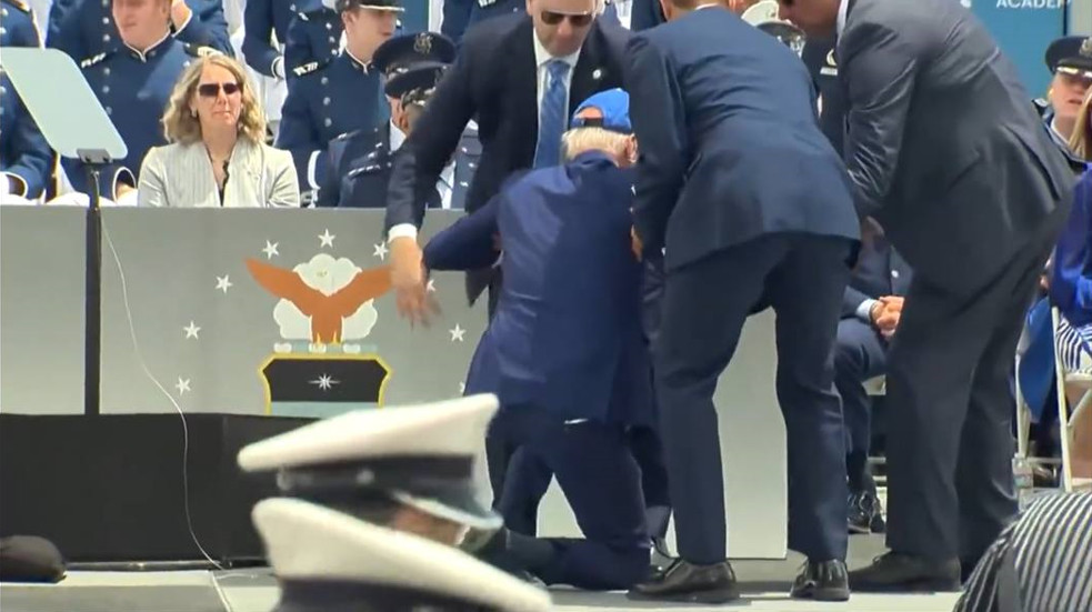 Γνωρίζοντας καλά ότι τα ερωτήματα για το αν στην ηλικία των 80 ετών μπορεί να ηγηθεί ξανά μιας υπερδύναμης είναι πολλά και με τη συμβουλή της επικοινωνιακής ομάδας του ότι μια εικόνα ίσον… χίλιοι ψήφοι, έκανε δυο πηδηματάκια μπροστά στους δημοσιογράφους λίγες ώρες μετά την πτώση του στην Ακαδημία της Πολεμικής Αεροπορίας και τους έκοψε τη φόρα για καυστικά σχόλια, λέγοντας από μόνος του: