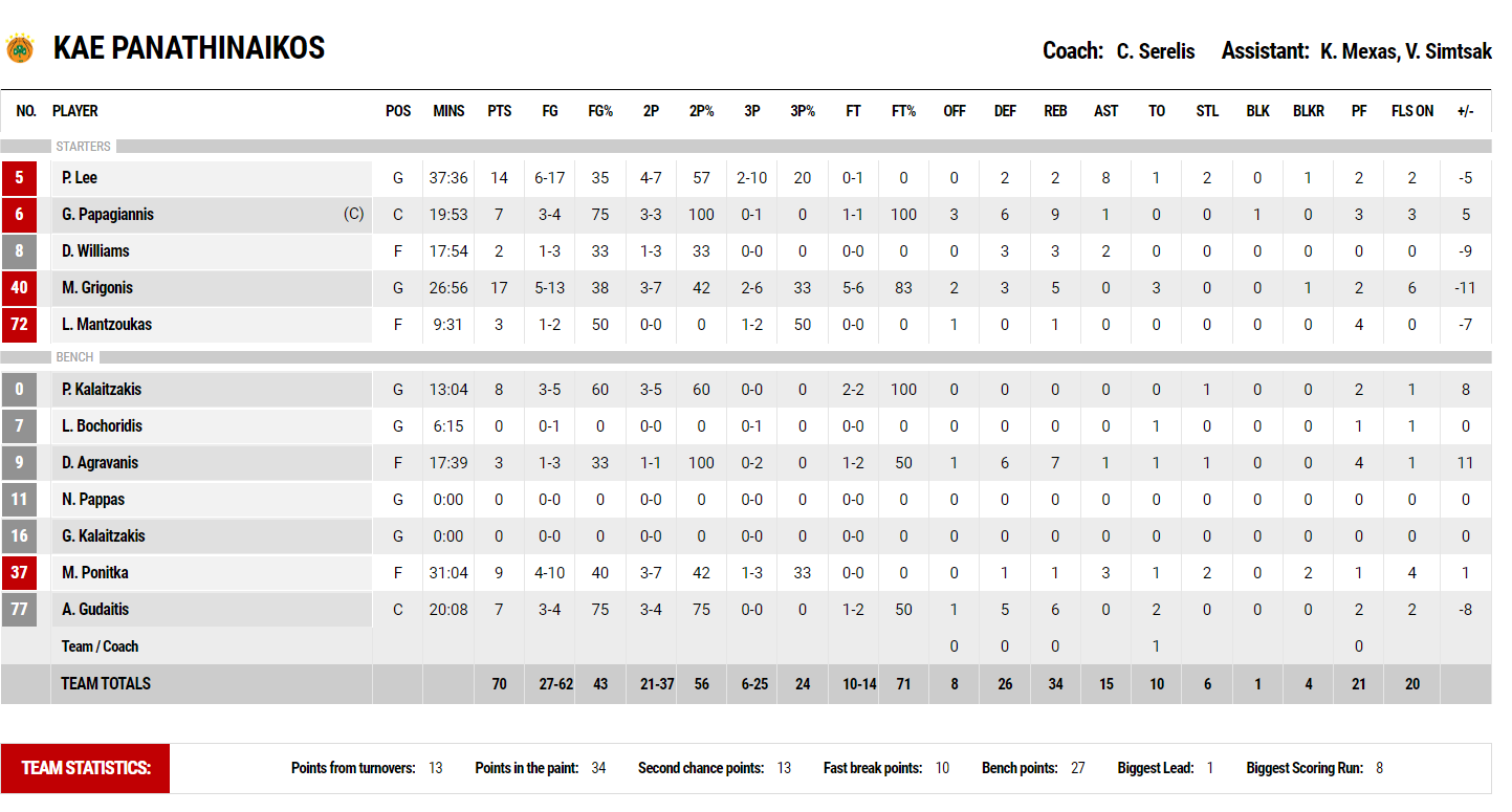 Κορυφαίος για τον Ολυμπιακό ο Σάσα Βεζένκοφ που τελείωσε την αναμέτρηση με 20 πόντους και 7 ριμπάουντ, καταλυτικός ο Φαλ με 11π. και 5 ασίστ. Για τον Παναθηναϊκό ξεχώρισαν Γκριγκόνις με 17π και Λι με 14π.