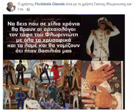 Ωστόσο, η τελευταία του ανάρτηση στο Facebook προκαλεί «ανατριχίλα», αφού θα μπορούσε να χαρακτηριστεί προφητική. Συγκεκριμένα, ο Γιάννης Φλωρινιώτης, τρεις ημέρες πριν τον θάνατό του, κοινοποίησε μία χιουμοριστική φωτογραφία, η οποία έγραφε: «Να δεις που σε χίλια χρόνια θα βρουν οι αρχαιολόγοι τον τάφο του Φλωρινιώτη με τα χρυσαφικά και τα λαμέ και θα νομίζουν πως ήταν βασιλιάς».