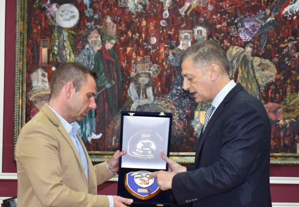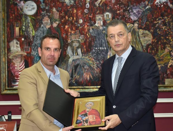 Στο τέλος της συνάντησης ο Υπουργός επέδωσε τον θυρεό του Υπουργείου Εθνικής Άμυνας στον Δήμαρχο, ο οποίος ανταπέδωσε δωρίζοντάς του μια εικόνα του Αγίου Μηνά.