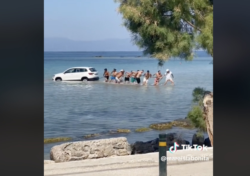 Οι λουόμενοι φαίνεται να έβαλαν τα δυνατά τους να καταφέρουν να βγάλουν το όχημα από την θάλασσα, δημιουργώντας «ανθρώπινη αλυσίδα».