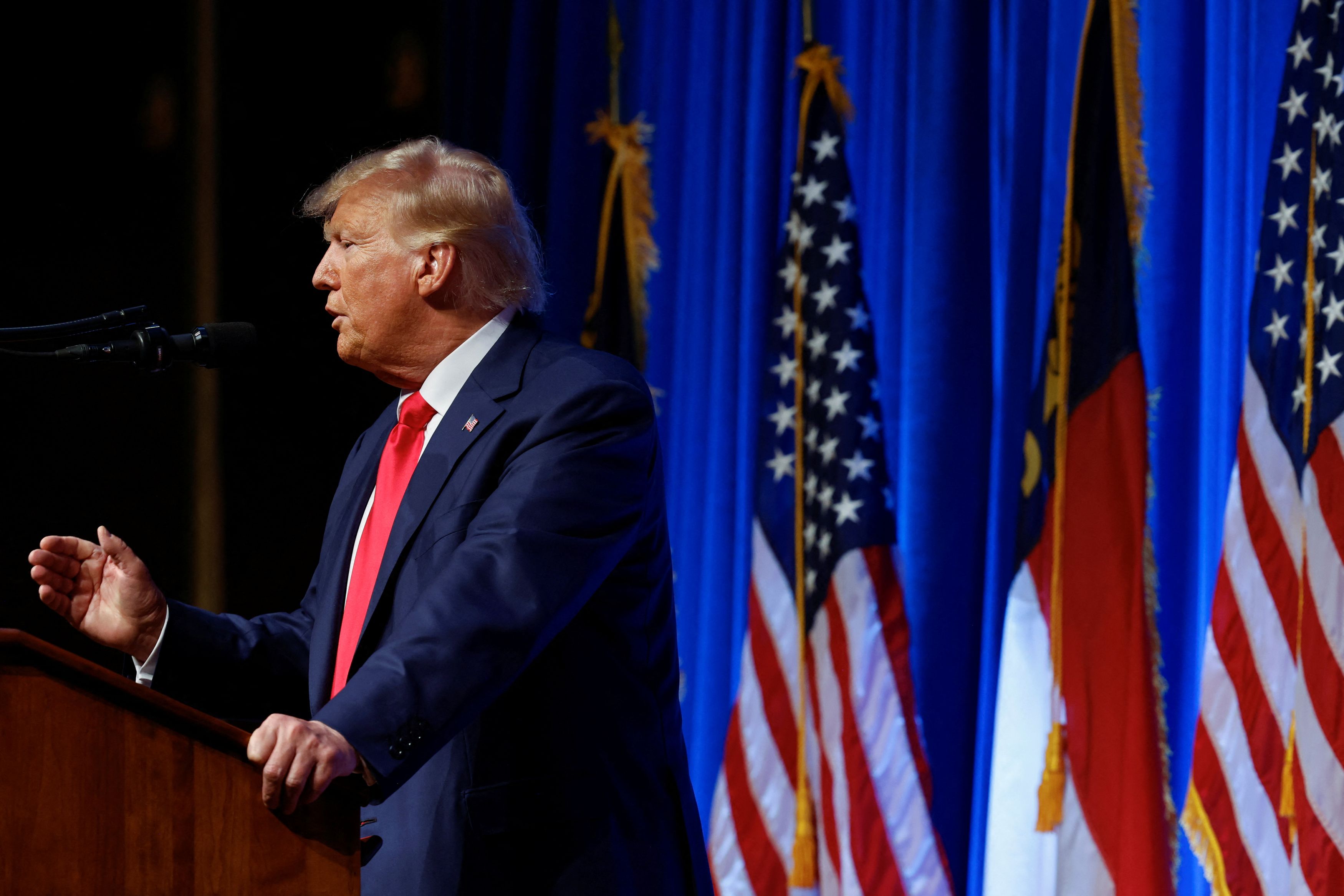 Στο αεροπλάνο για τη Βόρεια Καρολίνα μετά την ομιλία του στη Γεωργία, ο Τραμπ δήλωσε στο Politico ότι δεν θα εγκαταλείψει την προεδρική κούρσα, ακόμη και αν καταδικαστεί για τις τελευταίες κατηγορίες. «Δεν θα φύγω ποτέ» είπε. Όταν ρωτήθηκε αν θα έδινε χάρη στον εαυτό του αν γινόταν ξανά πρόεδρος, είπε: «Δεν νομίζω ότι θα χρειαστεί ποτέ να το κάνω … Δεν έκανα τίποτα κακό».