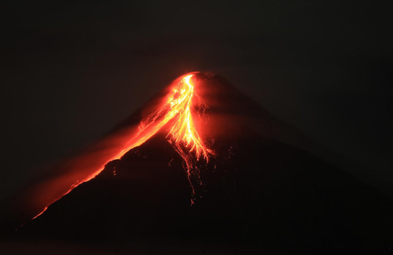 Λάβα ξεπηδά από τον κρατήρα του ηφαιστείου Μαγιόν, ύψους 2.462 μέτρων, στην περιοχή του οποίου κηρύχθηκε συναγερμός την περασμένη εβδομάδα έπειτα από σεισμικές δονήσεις και εκατοντάδες περιστατικά κατολισθήσεων που παρατηρήθηκαν.