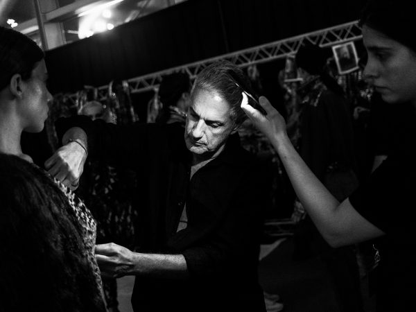 «Εντάξει» κάνει νεύμα με το χέρι του, «άσε με τώρα να αφουγκραστώ την κατάσταση» ψιθυρίζει, αφού έχουμε πάρει τη διαπίστευση, έχουμε κρεμάσει τα ταμπελάκια Press στον λαιμό και περιδιαβαίνουμε στον χώρο πίσω από την πασαρέλα.